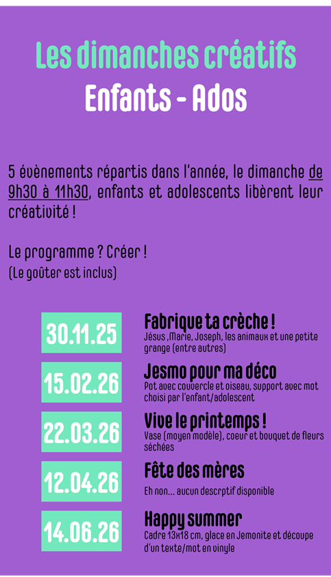 Pour des raisons d’organisation, l’inscription aux Dimanches créatifs est obligatoire et limitée à 6 enfants/adolescents.